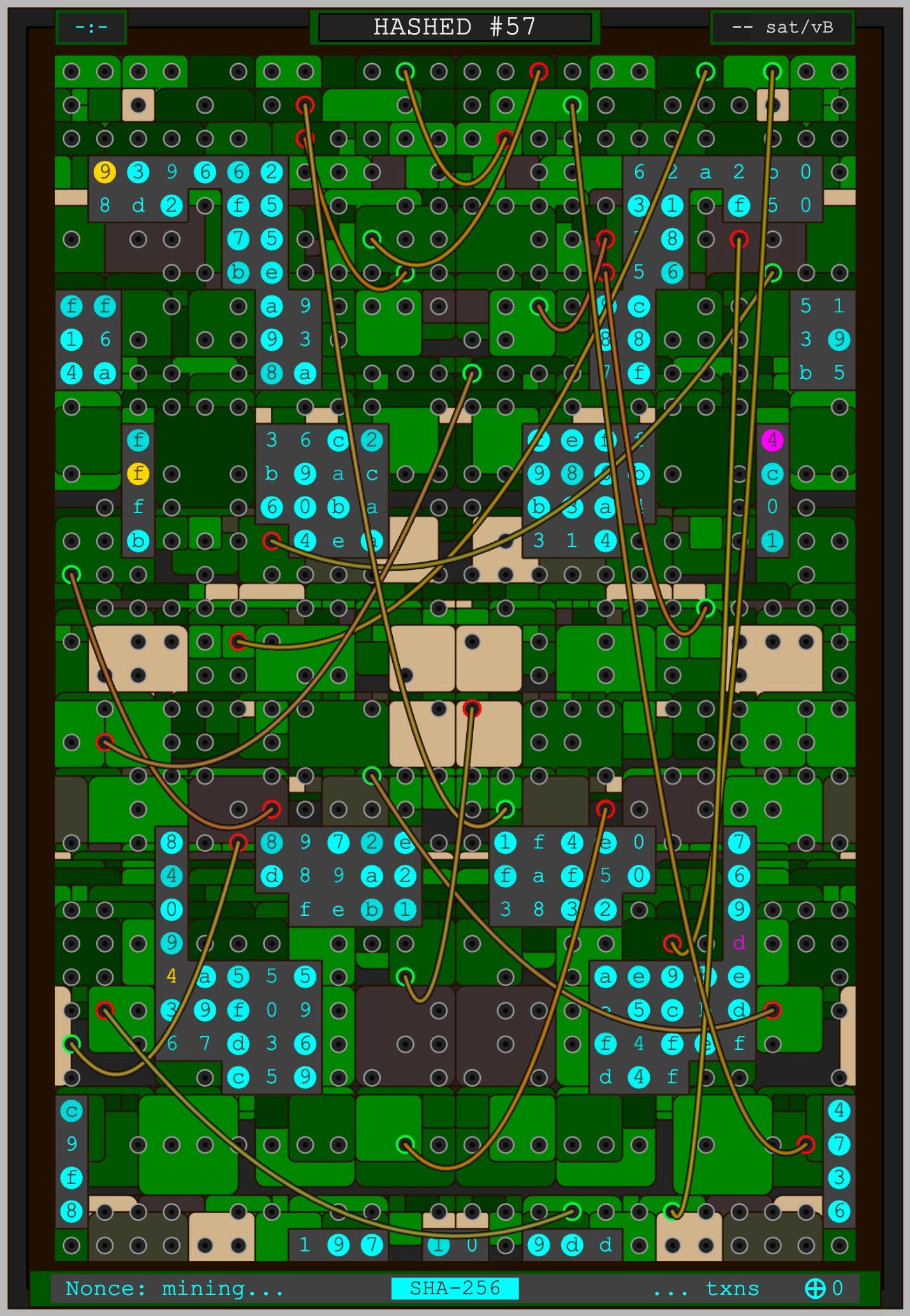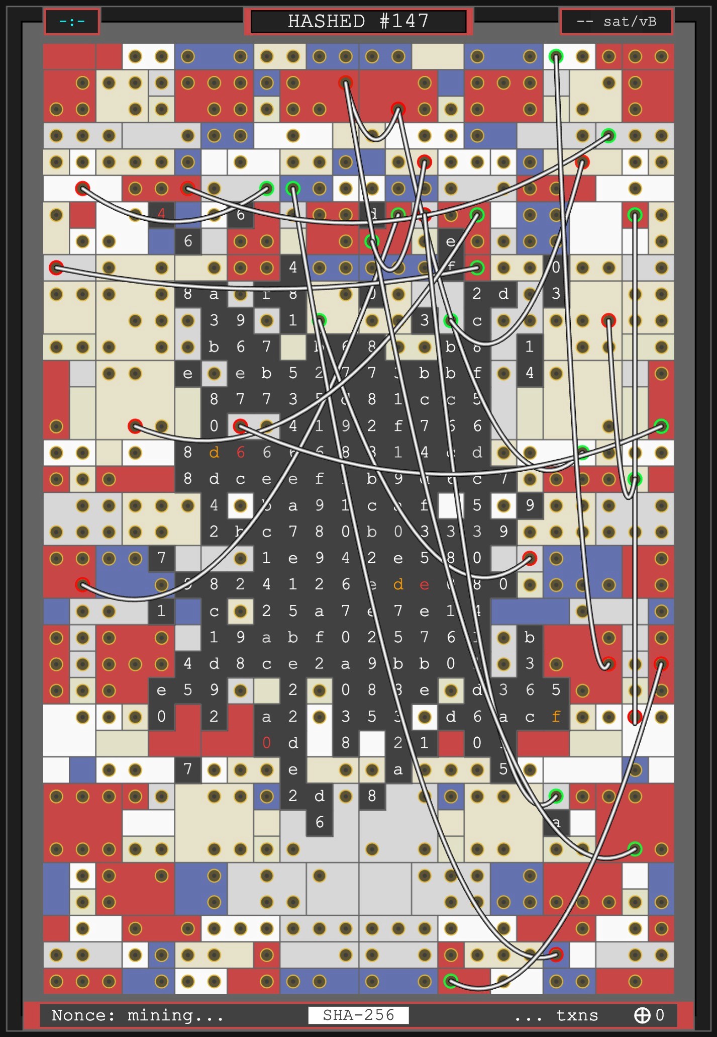 His latest project, Hashed, represents a technical and creative breakthrough in on-chain art. Using Ordinals' recursive endpoints, these pieces respond dynamically to real-time blockchain data, transforming current hash information, block numbers, timestamps, and fee data into interactive visual experiences. The aesthetic draws inspiration from retro plugboards and early computing machinery: abstract Bitcoin mining rigs that collectors can explore through on-chain interaction.